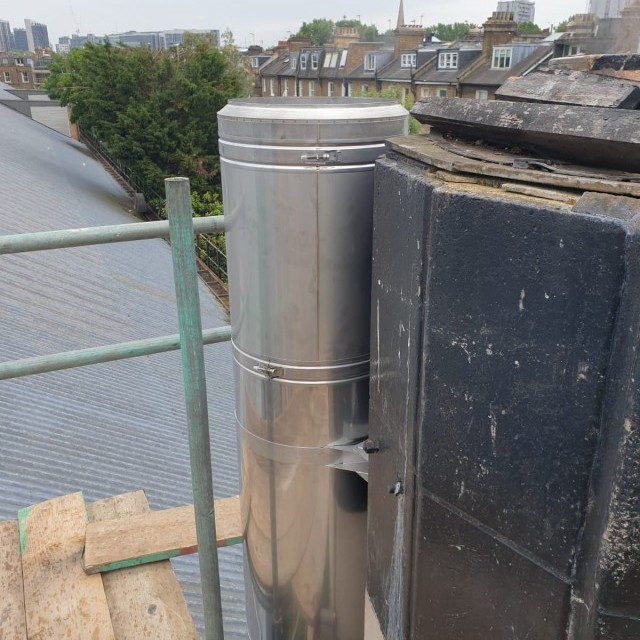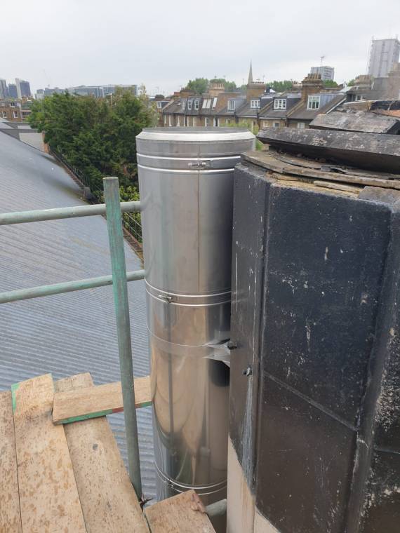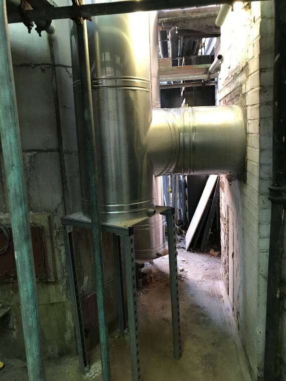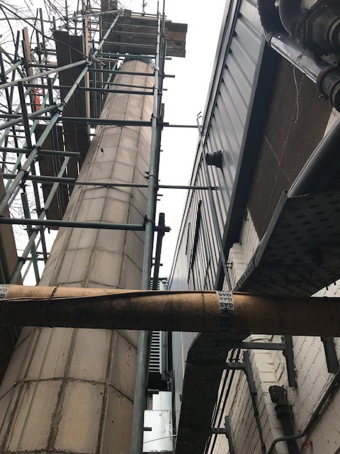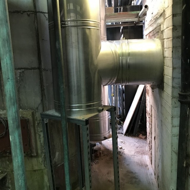 2 No 400mm ID stainless steel twin wall insulated flue systems were installed from the boilers through to outside the boiler room and then up the outside of the concrete stack for 15 metres.