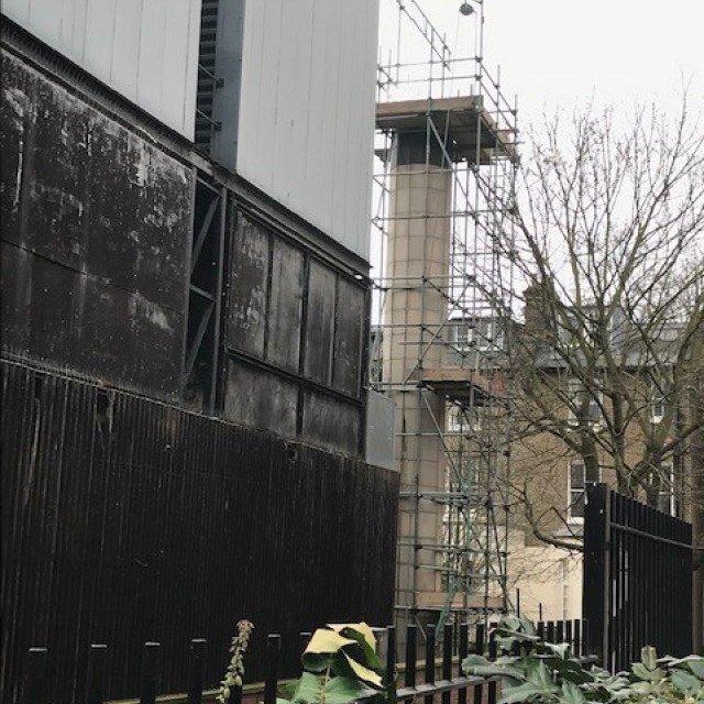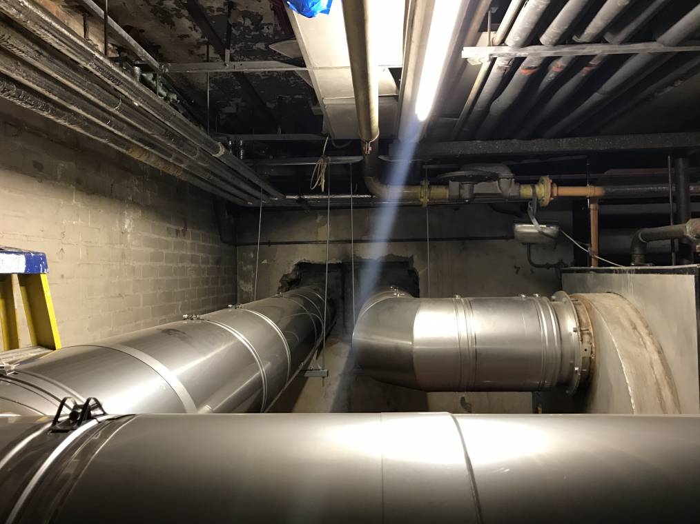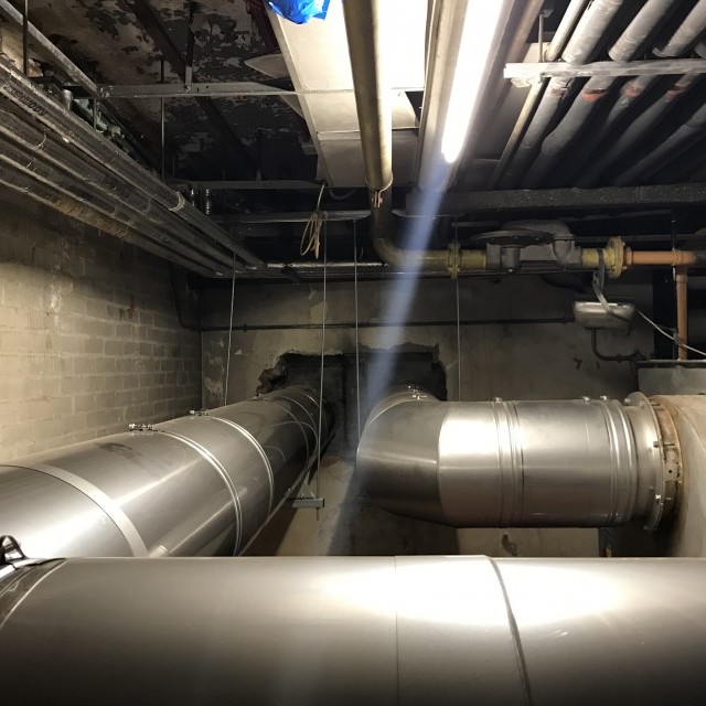 A flue system was required to serve 2 No 1200 KW Hartley & Sugden forced draught boilers at the BBC Studios in Maida Vale. The existing flue liner within a freestanding concrete stack had collapsed. It was not possible to reline the existing stack due to the collapsed liner and the difficulty of removing it so we had to find an alternative solution.