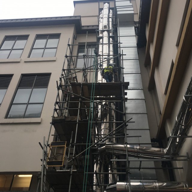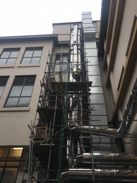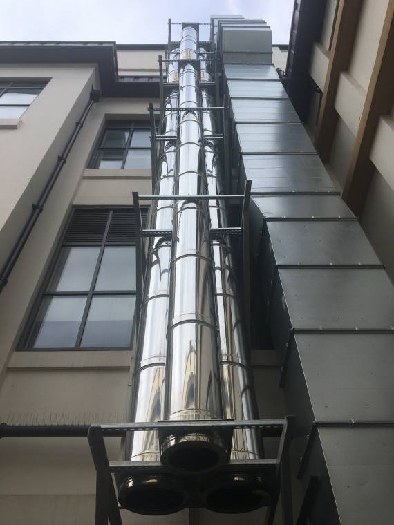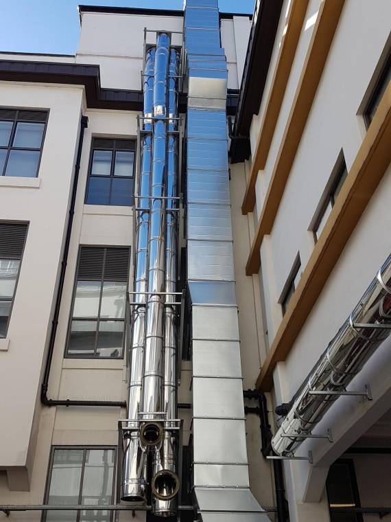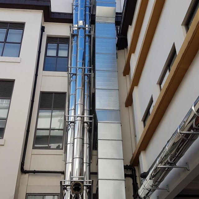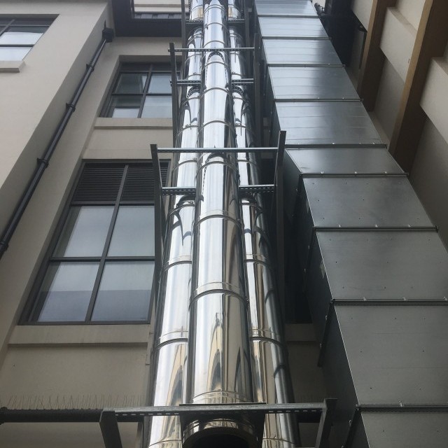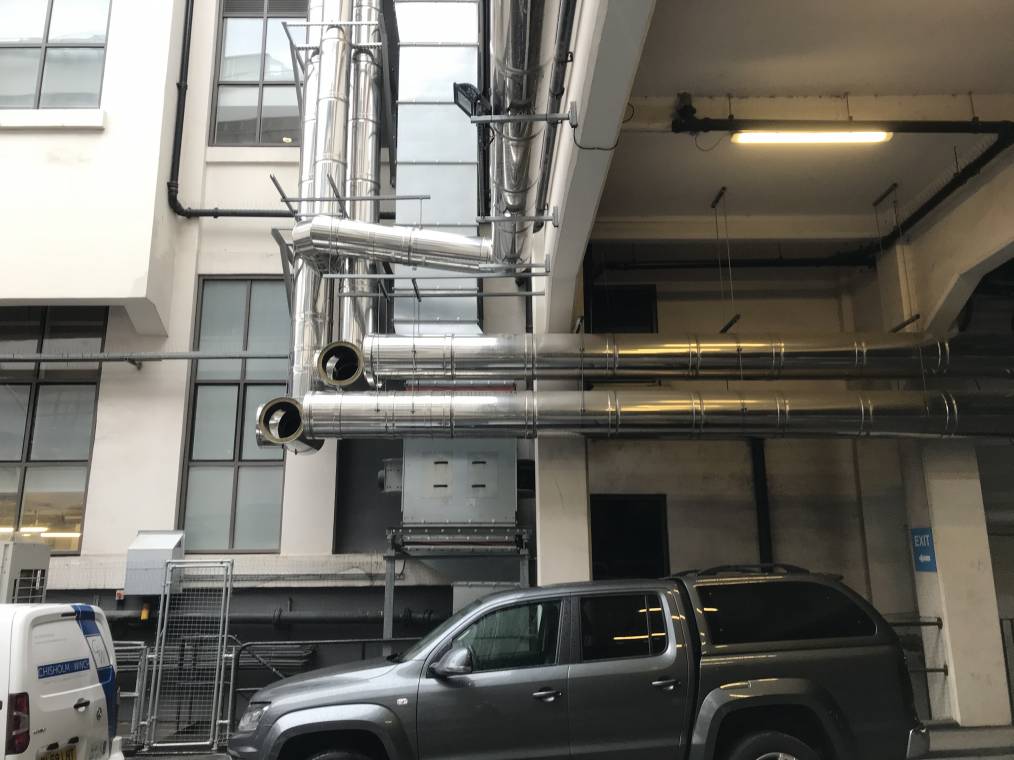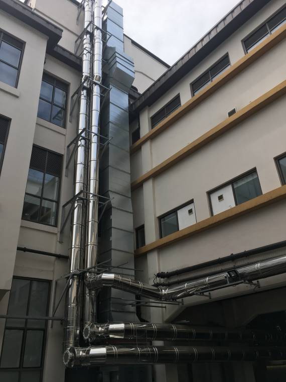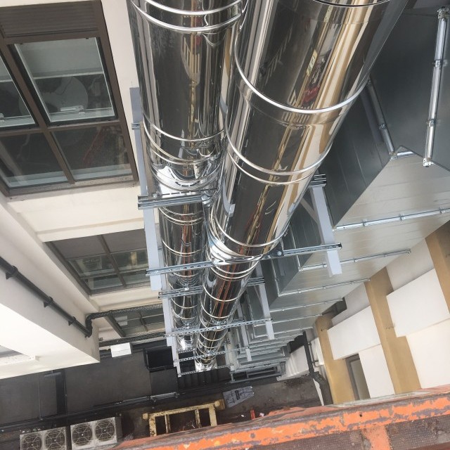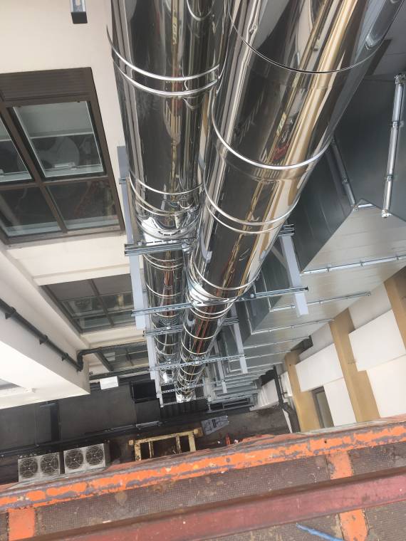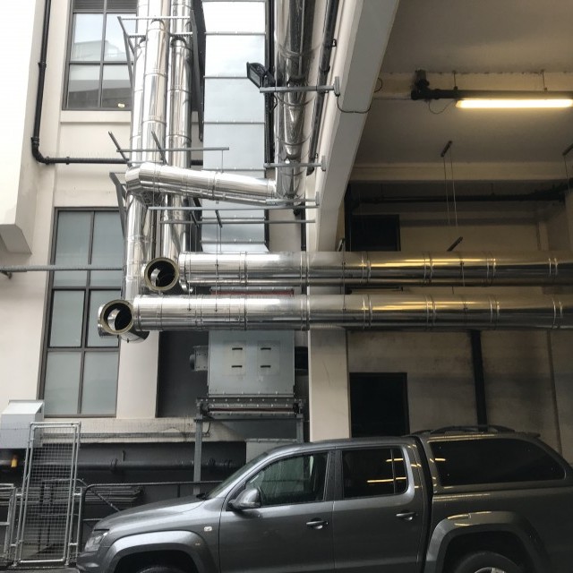 2 No 450mm ID and 1 No 350mm ID stainless steel twin wall insulated exhaust systems were installed in 2 separate phases. The vertical risers for all 3 systems were installed in the first phase in a triangular formation using specially designed brackets. The horizontal sections were installed in the second phase.