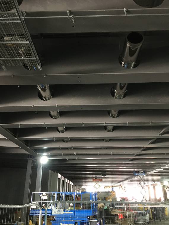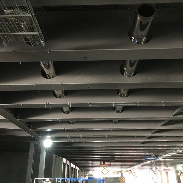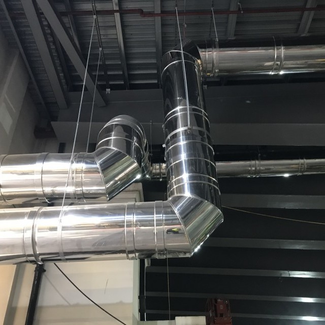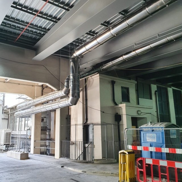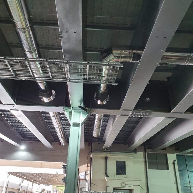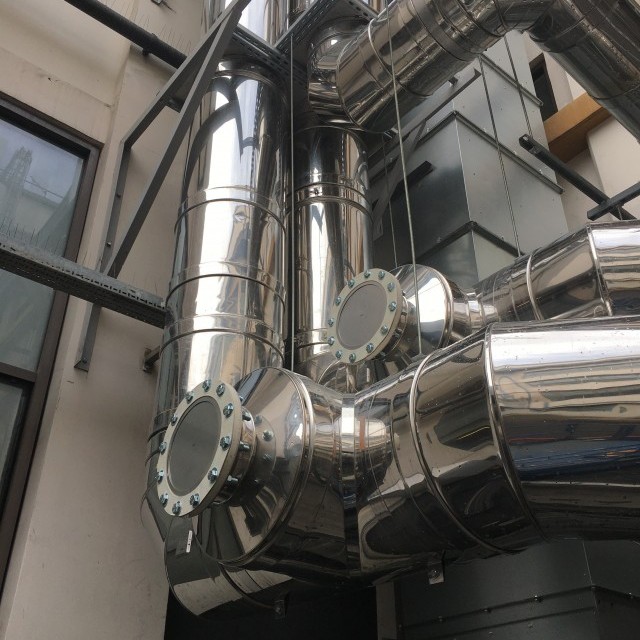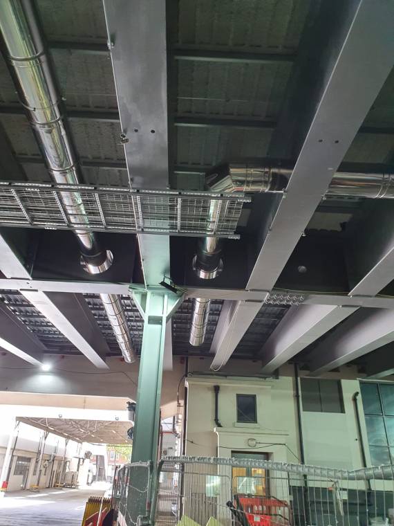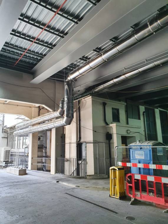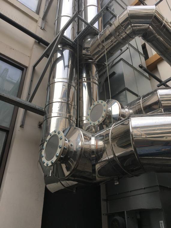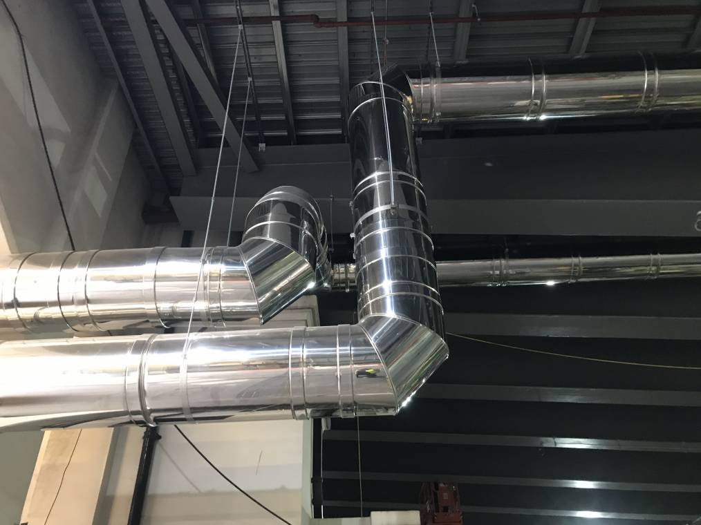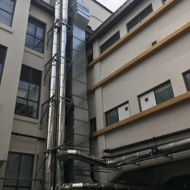 2 No 450mm ID and 1 No 350mm ID stainless steel twin wall insulated exhaust systems were installed in 2 separate phases. The vertical risers for all 3 systems were installed in the first phase in a triangular formation using specially designed brackets. The horizontal sections were installed in the second phase.