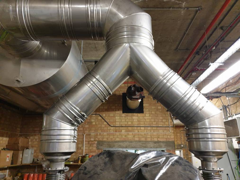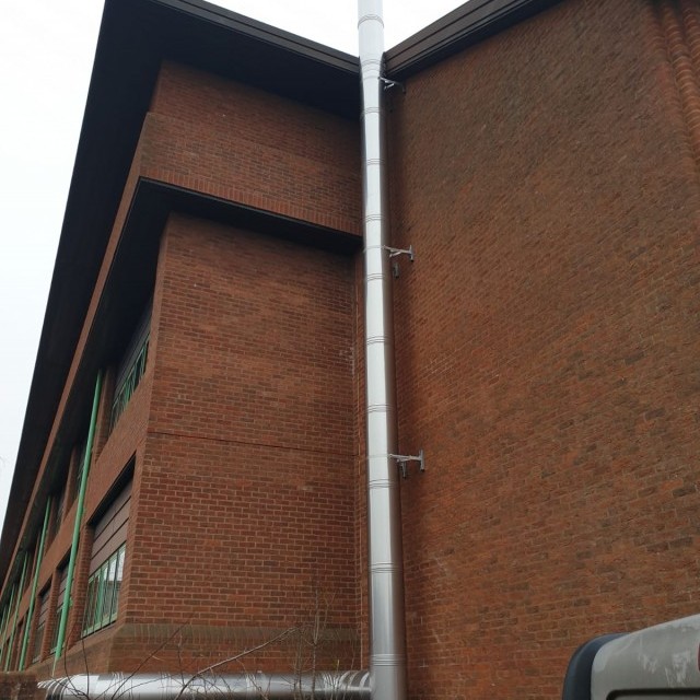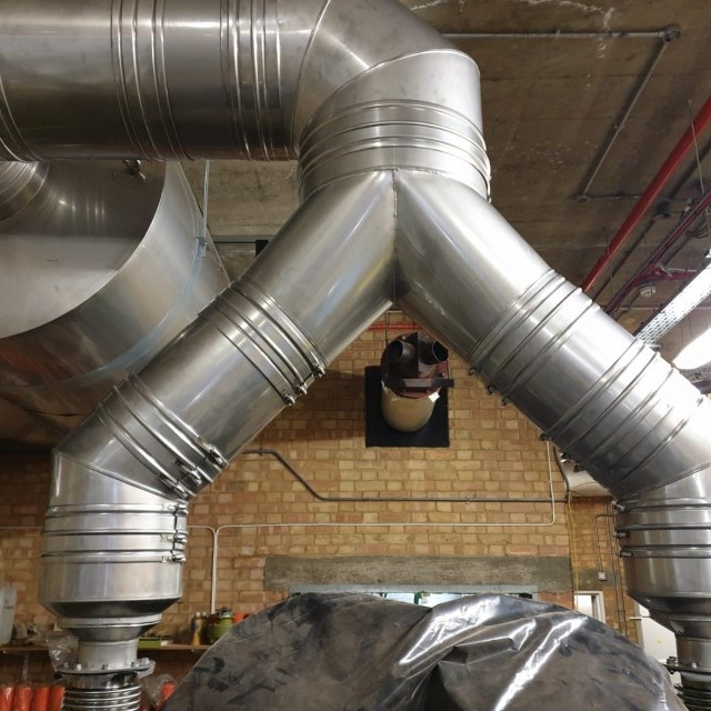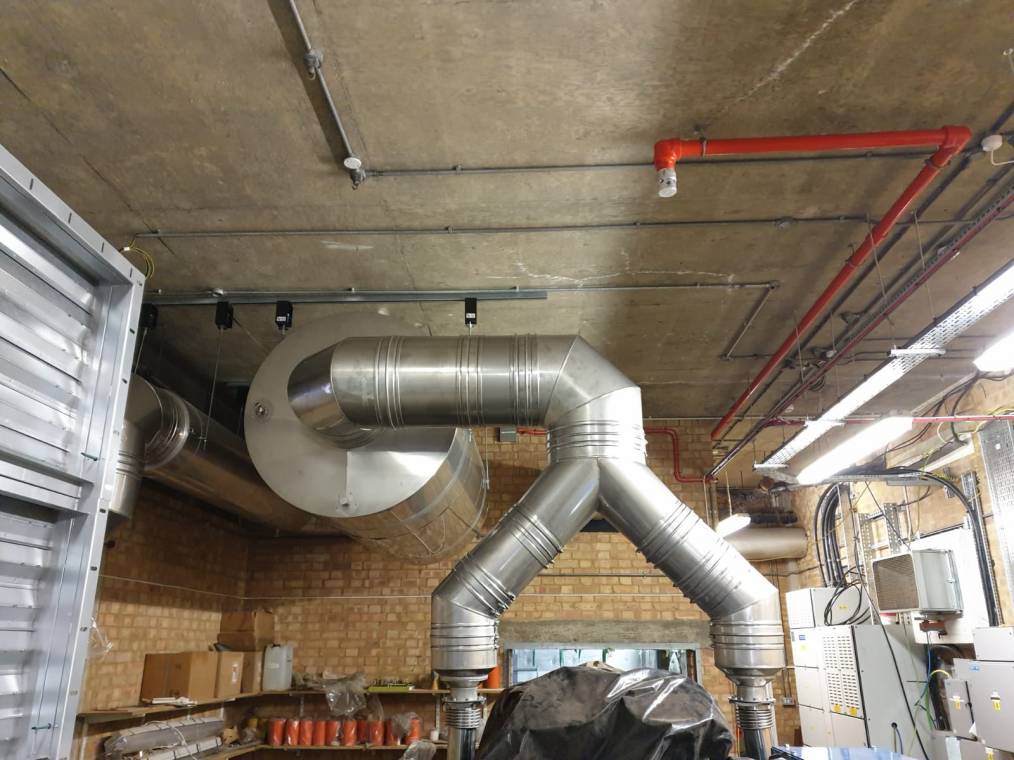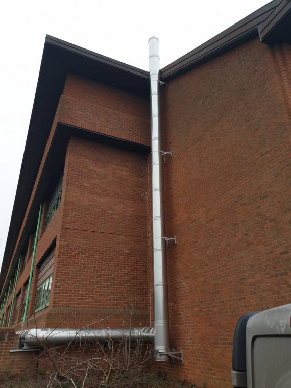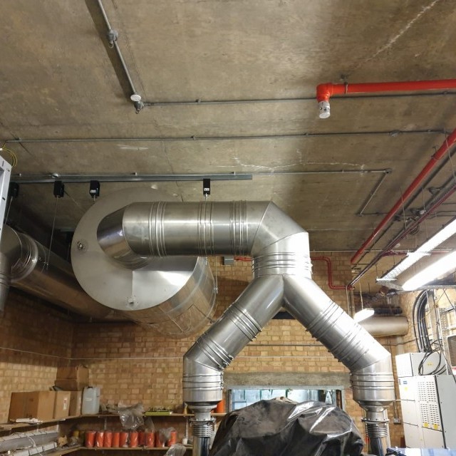1 No 350mm ID stainless steel twin wall insulated exhaust system including a silencer was installed with a 40 meter horizontal run and a 15 meter vertical riser to roof level.