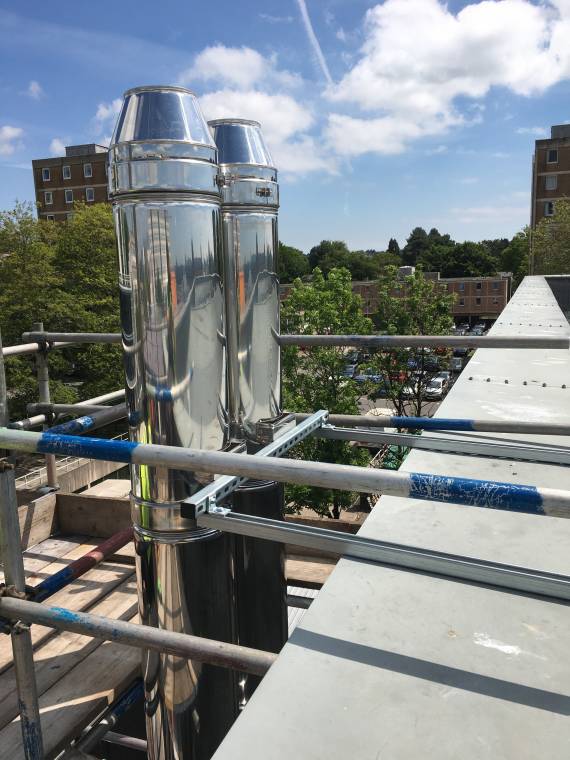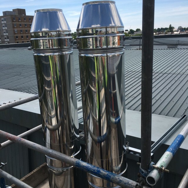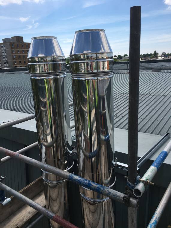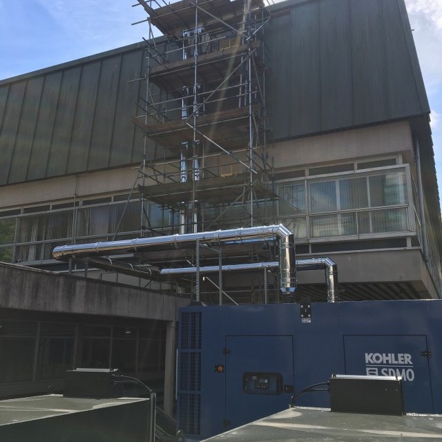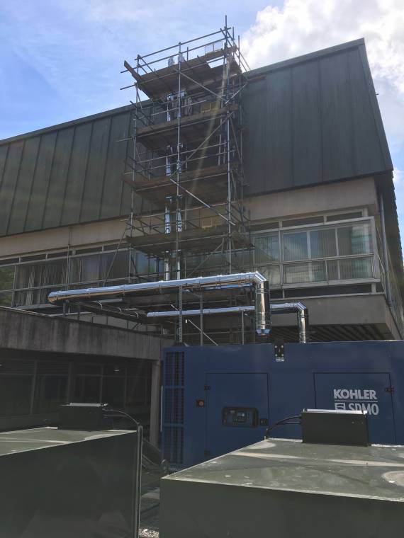 The original exhaust was causing the hospital problems with getting fumes coming through the windows above. On each system we installed a 200mm Dinak GE50+ system which took the exhaust up to above the roof level. This meant the hospital would not be without power in case of an outage and they no longer had to keep the windows shut to stop fumes.